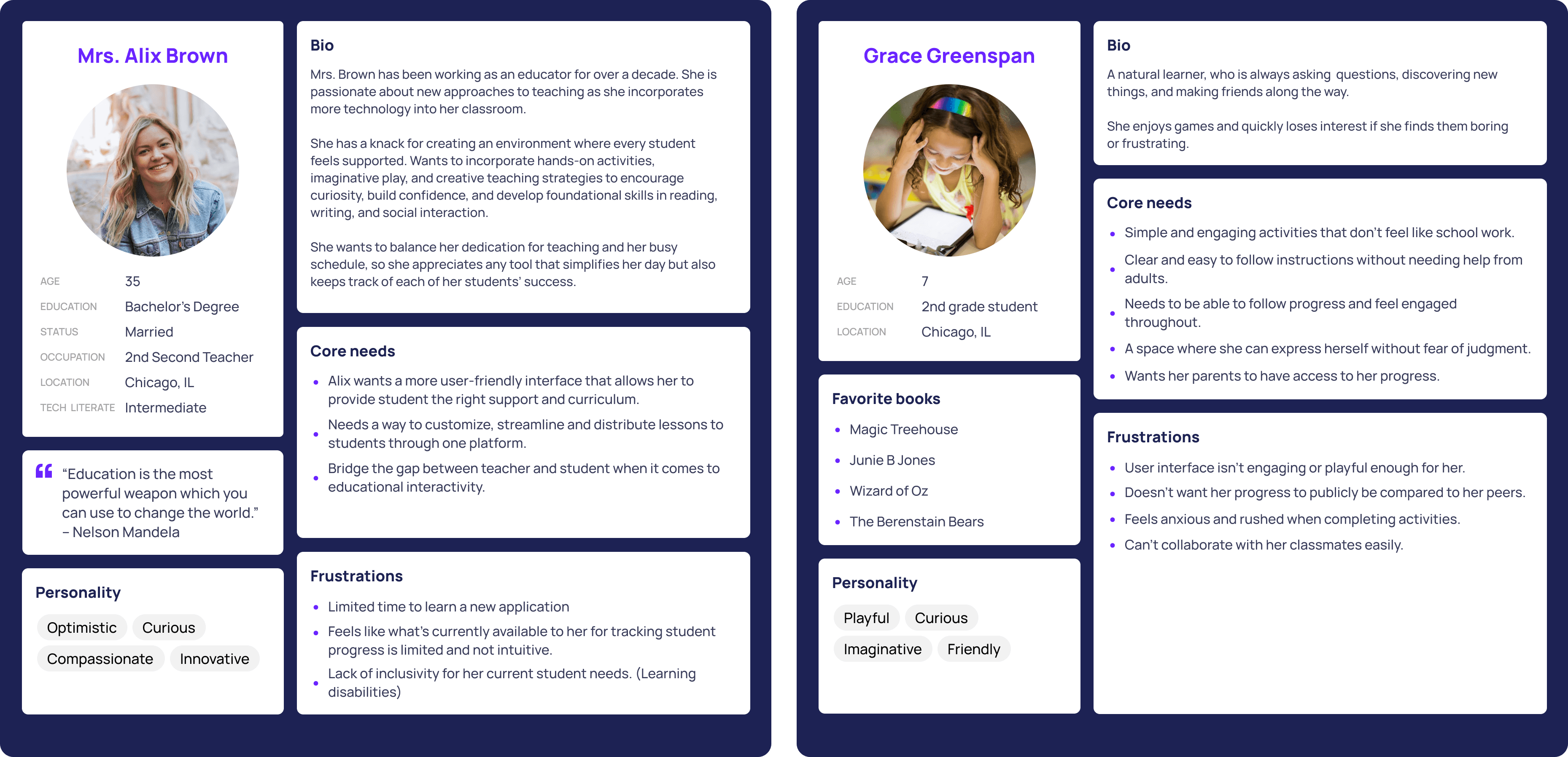 We analyzed existing educational apps to identify engagement gaps. We used this information to develop our two user personas, Mrs. Brown the teacher, and Grace the student to map out those contrasting needs. Upon creating our Mid-Fi prototype, we conducted feedback sessions via usability testing to identify any navigation friction or issues with cognitive load.