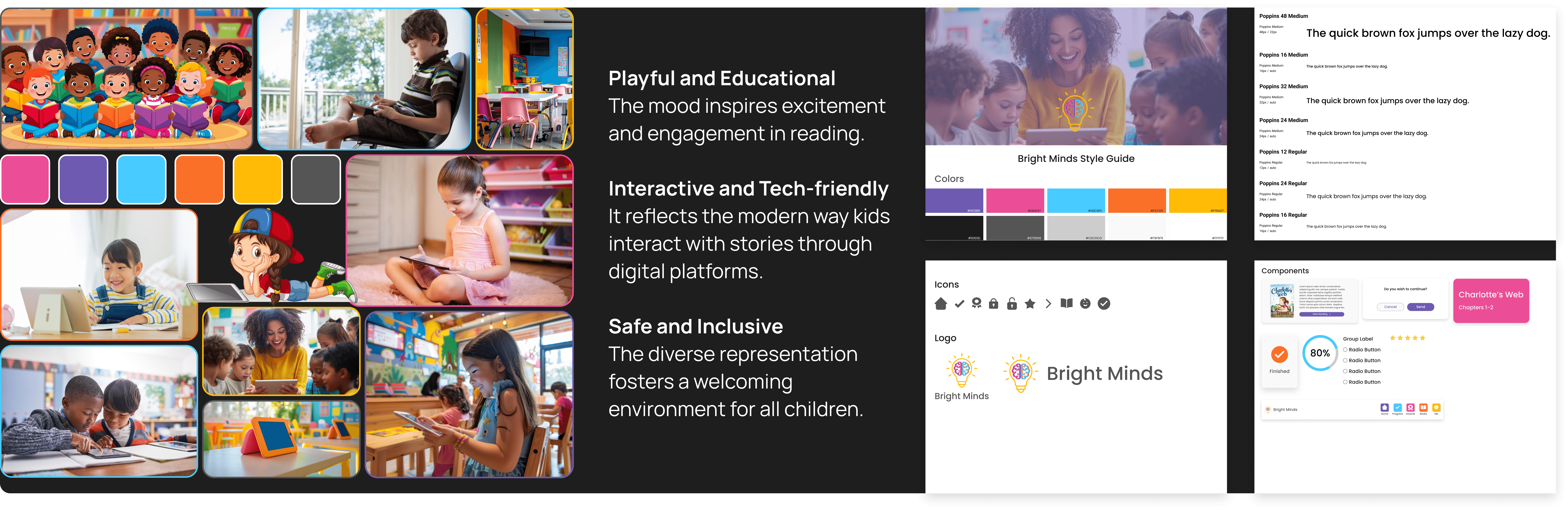We developed a moodboard and style guide focused on a playful, educational, and inclusive theme featuring bright colors and imagery of students interacting with technology. Our sketches and wireframe explore the layouts for the "Home", "Progress", "Profile", and "Share" screens.